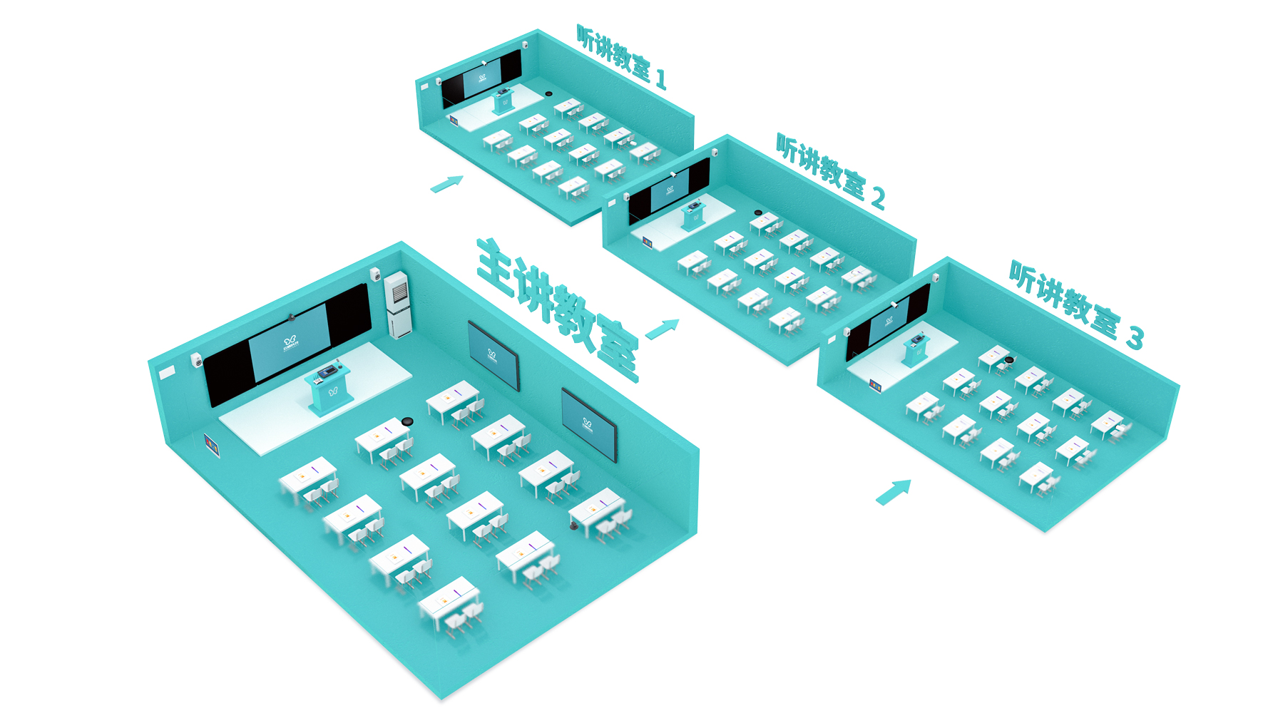 主講教室借助常態(tài)化互動錄播系統(tǒng)、智慧黑板互動顯示系統(tǒng)、交互一體機(jī)顯示系統(tǒng)、智能跟蹤攝像頭等,進(jìn)行音視頻信息的采集,完成課程的直播或錄播。聽講教室由交互一體機(jī)顯示系統(tǒng)、高清攝像機(jī)等組成,還可搭配錄播主機(jī)、拾音麥等實(shí)現(xiàn)更多元的聽課互動。