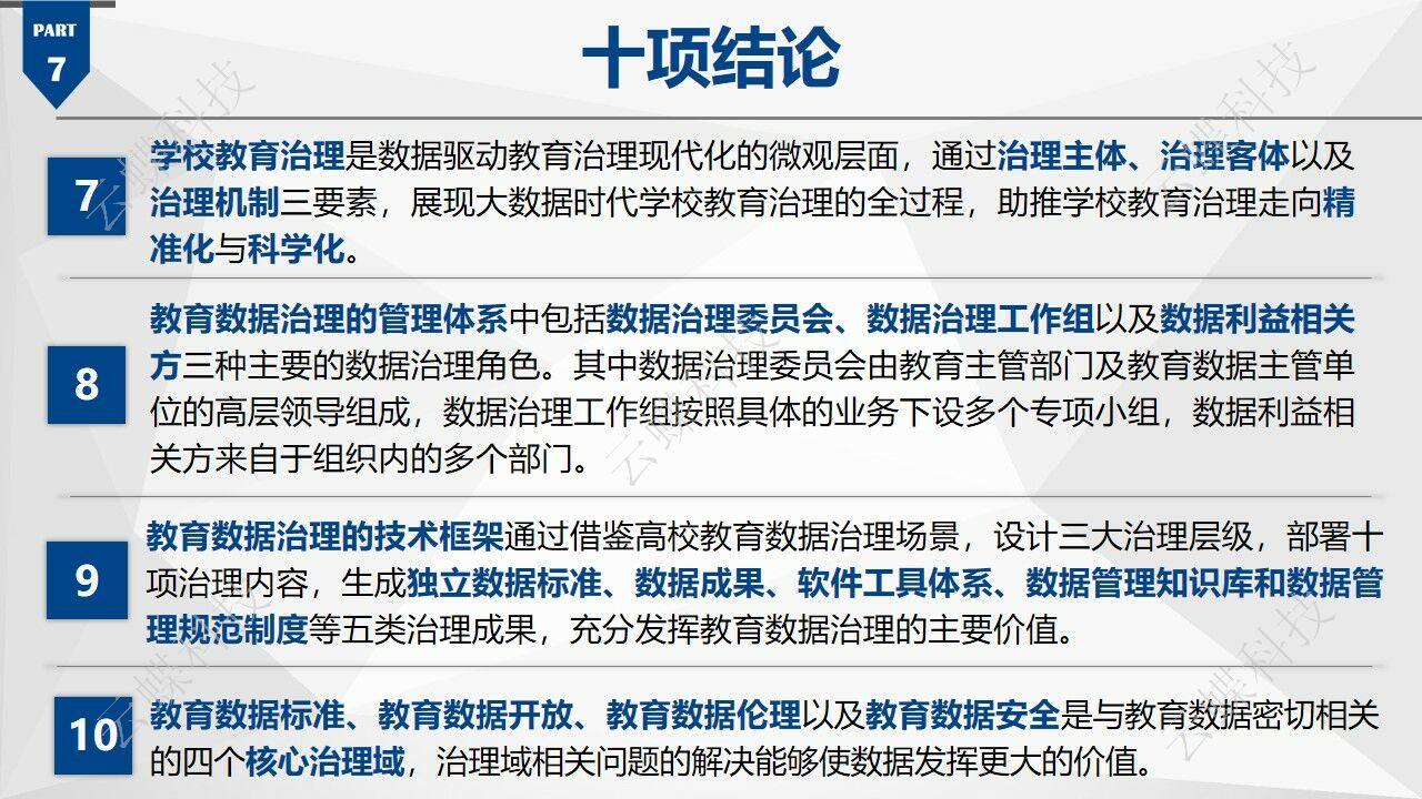而后,報(bào)告回到教育數(shù)據(jù)治理上,提出教育數(shù)據(jù)治理能夠解決數(shù)據(jù)從無用到有用,從難用到易用的問題,并解析了相關(guān)的理論體系與技術(shù)框架。