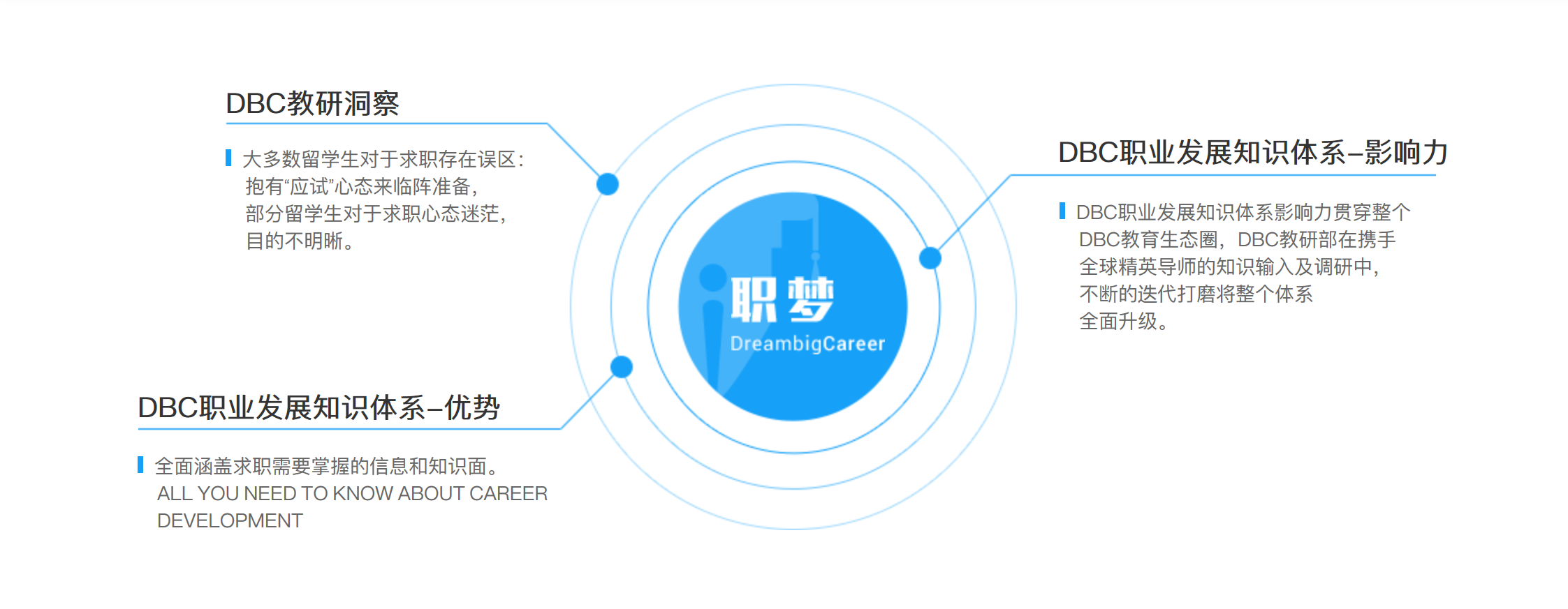教育的核心關(guān)鍵在于人才的培養(yǎng),發(fā)揮數(shù)據(jù)資源的價(jià)值、促進(jìn)個(gè)性人才的發(fā)展是未來人才培養(yǎng)的重要趨勢。DreambigCareer職夢(以下簡稱DBC職夢)是博實(shí)樂教育集團(tuán)旗下的專門從事留學(xué)生職業(yè)規(guī)劃的子公司,也是第一家擁有APP的留學(xué)生求職輔導(dǎo)平臺(tái)。職夢自主研發(fā)“移動(dòng)求職學(xué)院”在線學(xué)習(xí)系統(tǒng),專注于留學(xué)生職業(yè)發(fā)展綜合能力以及個(gè)性化發(fā)展能力培養(yǎng)與提升。2019年3月DBC職夢推出全新升級學(xué)習(xí)平臺(tái)——移動(dòng)學(xué)院3.0,依托其官方APP、求職小蜜蜂、DBC學(xué)院、求職能力測評等微信小程序,以行業(yè)認(rèn)知、求職技能、職業(yè)素養(yǎng)為核心課程模塊,匯集全球2000+精英導(dǎo)師資源,500+官方合作企業(yè),有效構(gòu)建了提升個(gè)人競爭力的全方位求職移動(dòng)產(chǎn)品矩陣。
