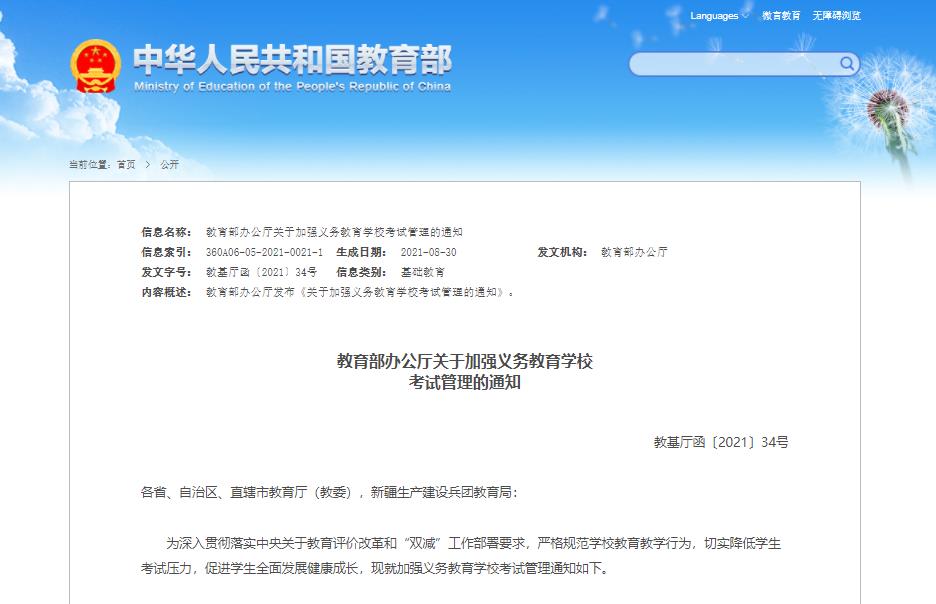 8月教育部印發(fā)《關(guān)于加強義務(wù)教育學(xué)??荚嚬芾淼耐ㄖ?,提出了準確把握考試功能、大幅壓減考試次數(shù)、規(guī)范考試命題管理、合理運用考試結(jié)果、完善學(xué)習(xí)過程評價、加強學(xué)業(yè)質(zhì)量監(jiān)測、健全管理監(jiān)督機制等要求。