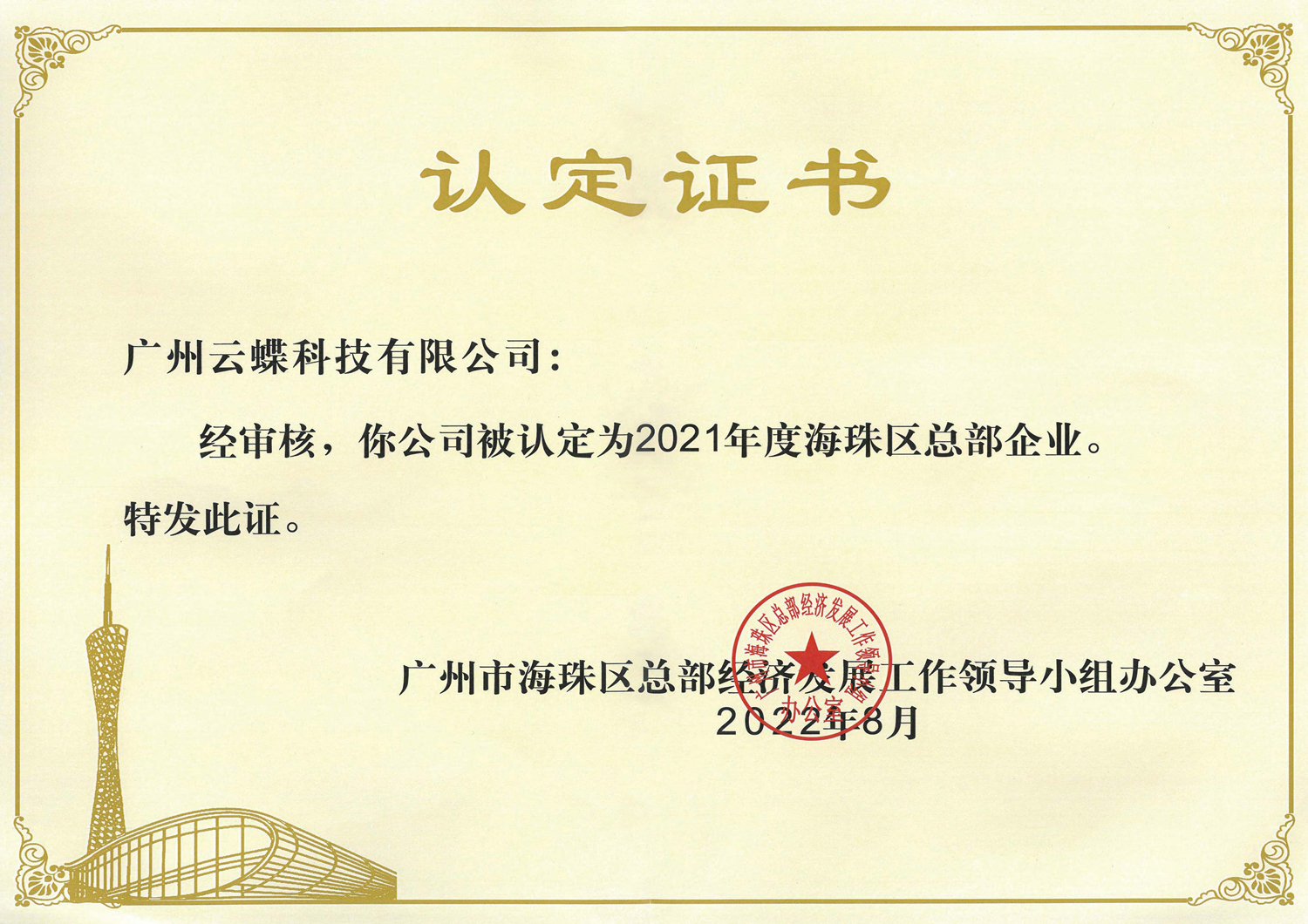 近日, 2021年度海珠區(qū)總部企業(yè)評選結(jié)果出爐,廣州云蝶科技有限公司憑借綜合實(shí)力與穩(wěn)健發(fā)展連續(xù)兩年收獲該項(xiàng)認(rèn)定。