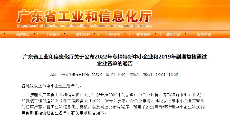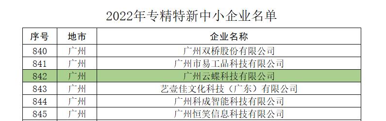 新年伊始,廣東省工業(yè)和信息化廳公布2022年專精特新中小企業(yè)名單,經企業(yè)申請、地市初審、省工信廳復核等程序,廣州云蝶科技有限公司順利通過廣東省專精特新中小企業(yè)認定。