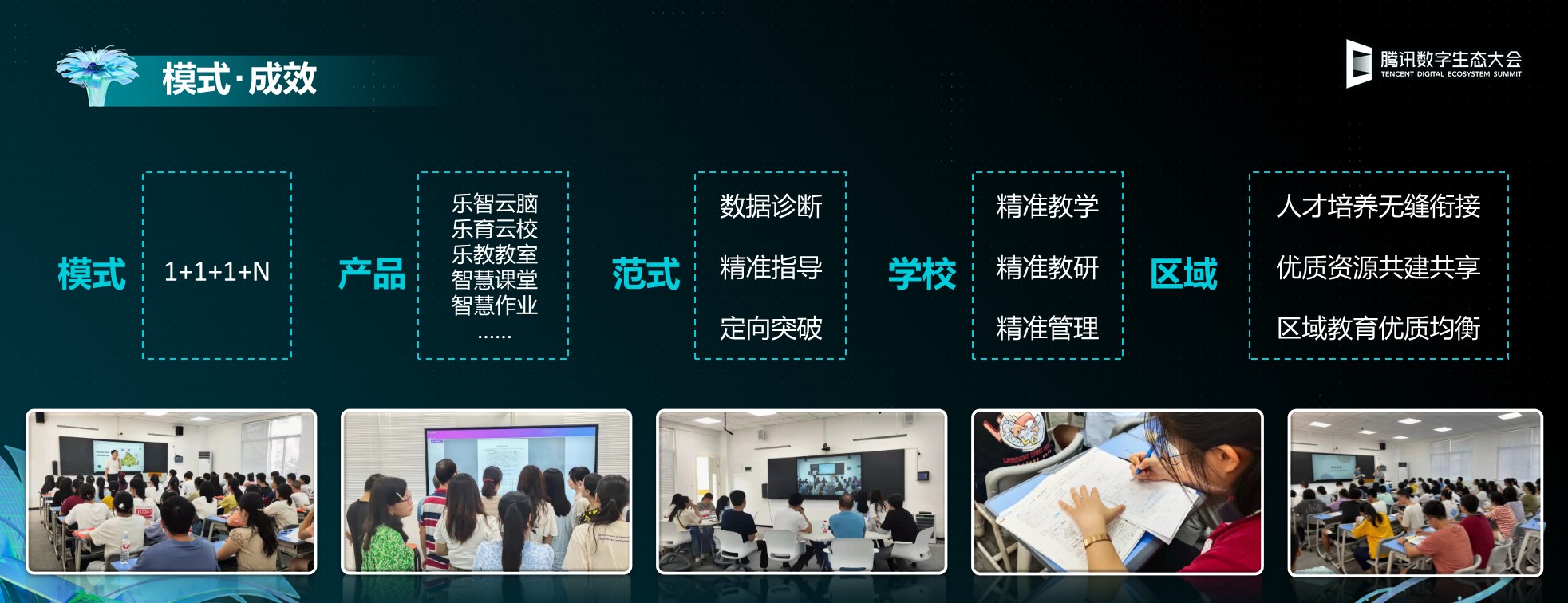 在探索數(shù)據(jù)驅(qū)動教育優(yōu)質(zhì)均衡發(fā)展的過程中,云蝶科技和騰訊教育聯(lián)動合作,發(fā)揮各自的技術(shù)和資源優(yōu)勢,探索出數(shù)據(jù)驅(qū)動的五大路徑:數(shù)據(jù)感知、教研提效、教學(xué)提質(zhì)、管理提升和區(qū)域發(fā)展。