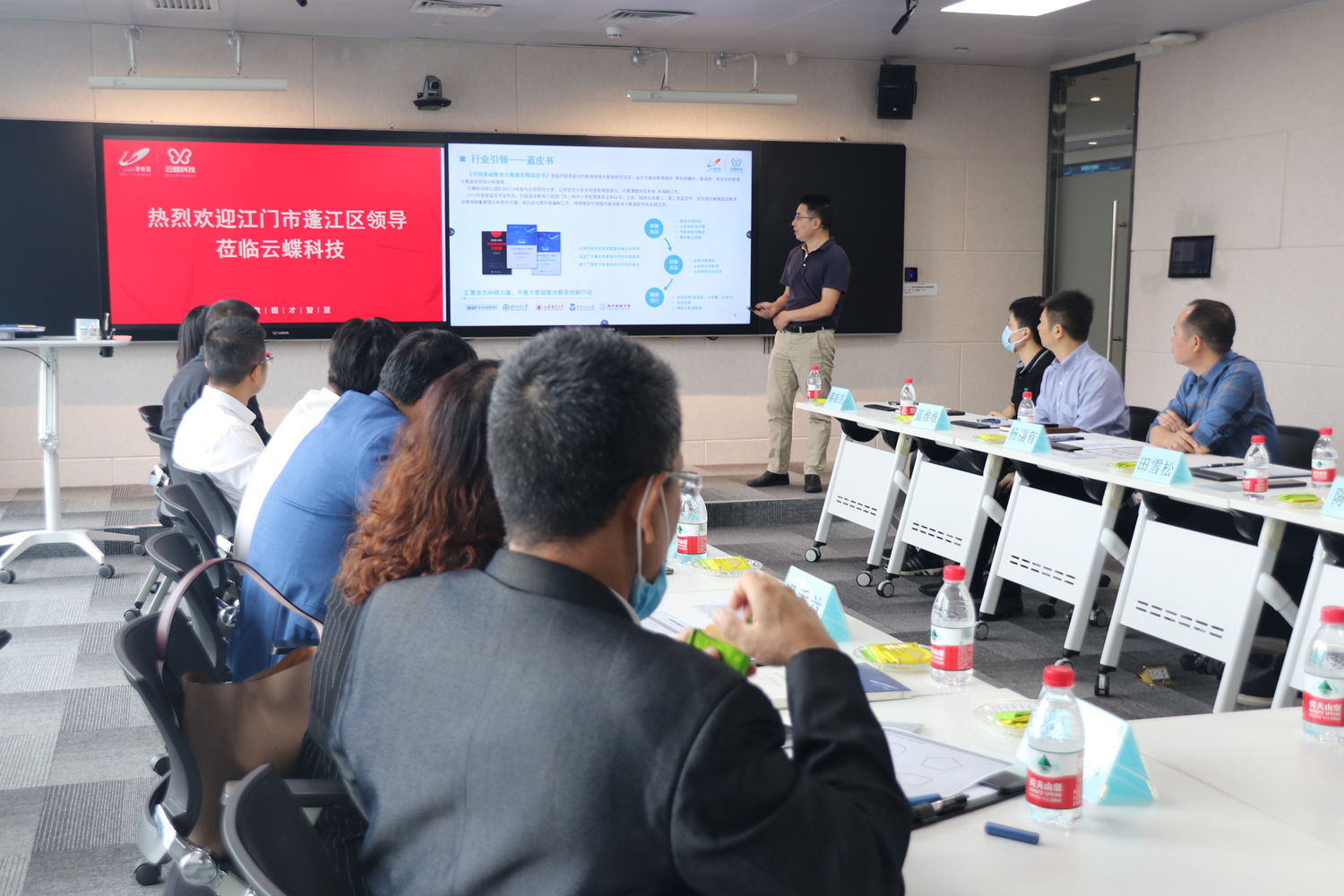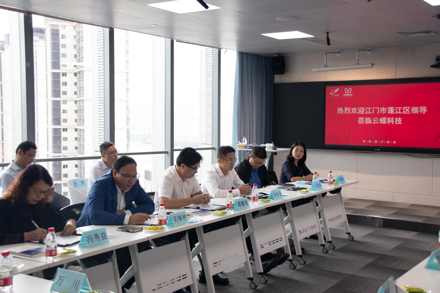 10月16日,江門(mén)市蓬江區(qū)政府辦公室副主任譚耀棠,江門(mén)市蓬江區(qū)教育局局長(zhǎng)張懷業(yè)、副局長(zhǎng)吳鋒林等一行到訪云蝶科技,詳細(xì)了解智慧教育相關(guān)應(yīng)用,并與云蝶科技總裁田雪松、副總裁陳天、副總裁藍(lán)維維,廣東珀思科技有限公司董事長(zhǎng)楊福有等共同舉行座談。
