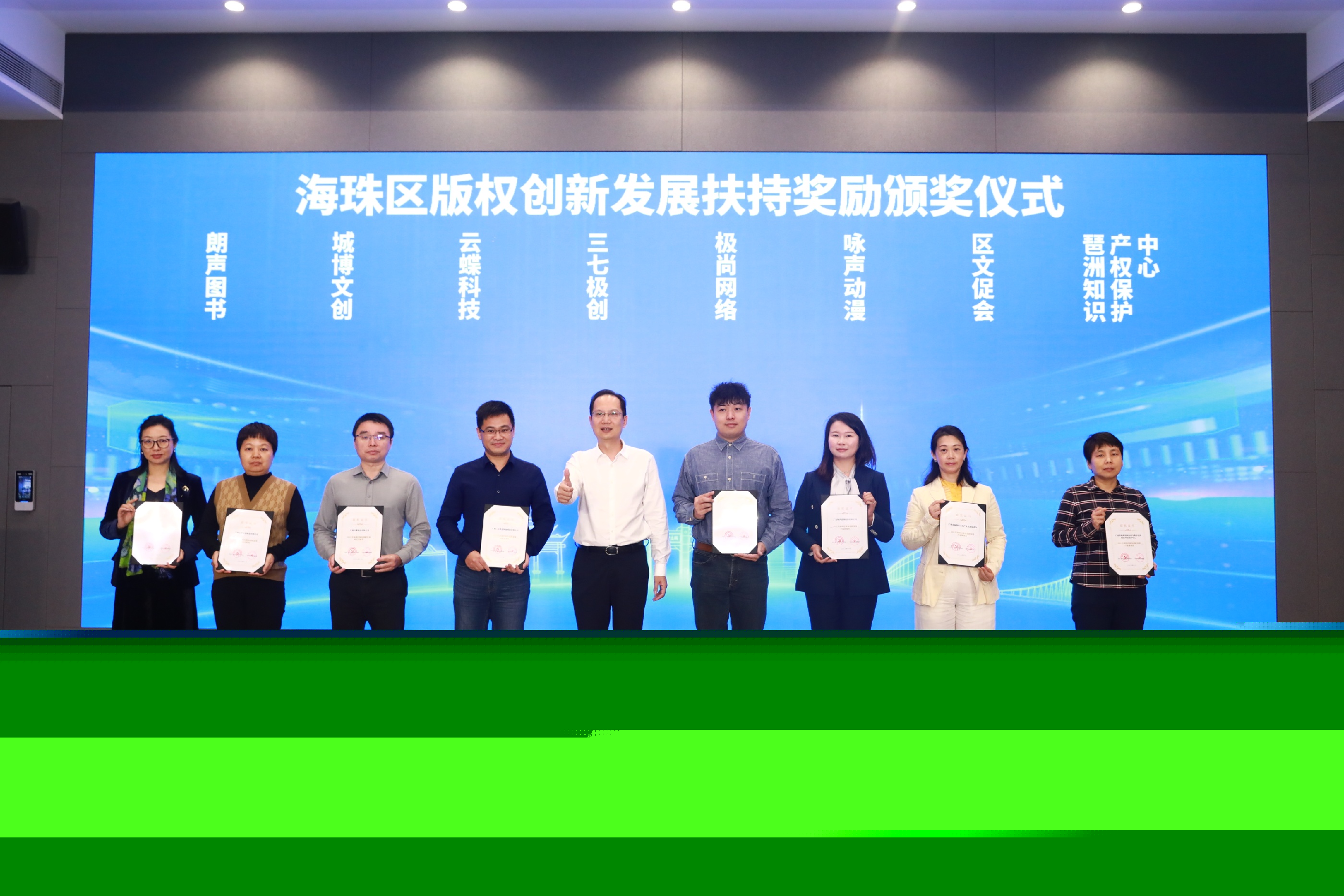 在海珠區(qū)數(shù)字文化創(chuàng)意產(chǎn)業(yè)發(fā)展推介交流活動(dòng)上,八家共獲超百萬(wàn)獎(jiǎng)勵(lì)扶持的版權(quán)企業(yè)現(xiàn)場(chǎng)接受頒獎(jiǎng)。云蝶科技副總裁陳天博士代表云蝶科技接過(guò)2023年海珠區(qū)版權(quán)創(chuàng)新發(fā)展成長(zhǎng)貢獻(xiàn)獎(jiǎng)獎(jiǎng)狀。會(huì)后他在接受記者采訪時(shí)表示,版權(quán)政策的出臺(tái),讓民營(yíng)科技企業(yè)深受鼓舞,云蝶科技將牢牢把握數(shù)字經(jīng)濟(jì)產(chǎn)業(yè)鏈集聚優(yōu)勢(shì),立足海珠,通過(guò)科技創(chuàng)新與數(shù)字化升級(jí),為海珠區(qū)版權(quán)產(chǎn)業(yè)發(fā)展插上數(shù)字翅膀。