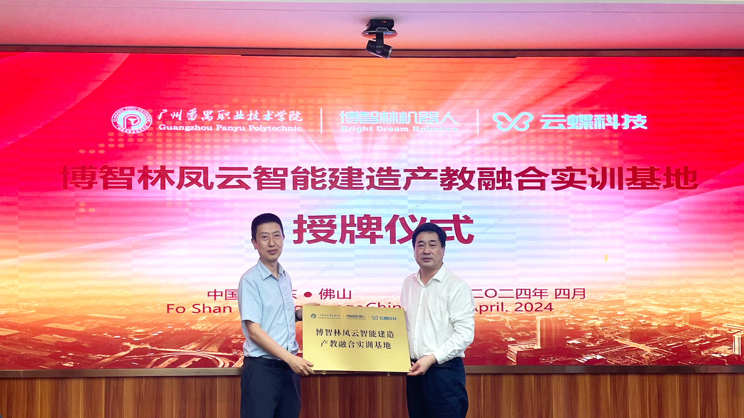 為推進(jìn)校企深度合作,提升人才培養(yǎng)水平,4月3日,廣州番禺職業(yè)技術(shù)學(xué)院智能建造技術(shù)創(chuàng)新中心、產(chǎn)教融合實訓(xùn)基地揭牌儀式在廣東佛山順利舉行。廣州番禺職業(yè)技術(shù)學(xué)院校長馬仁聽、建筑工程學(xué)院院長葉雯、校企合作辦主任齊立輝,博智林副總裁劉震,云蝶科技營銷中心副總經(jīng)理霍天龍以及多位校方領(lǐng)導(dǎo)、企業(yè)代表出席活動。