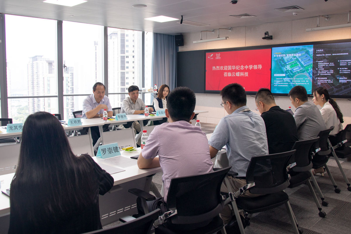 10月13日,國華紀(jì)念中學(xué)校長季德華一行來到云蝶科技總部,與云蝶科技總裁田雪松、副總裁陳天、副總裁藍(lán)維維等共同交流信息技術(shù)輔助教育教學(xué)的實(shí)踐工作。