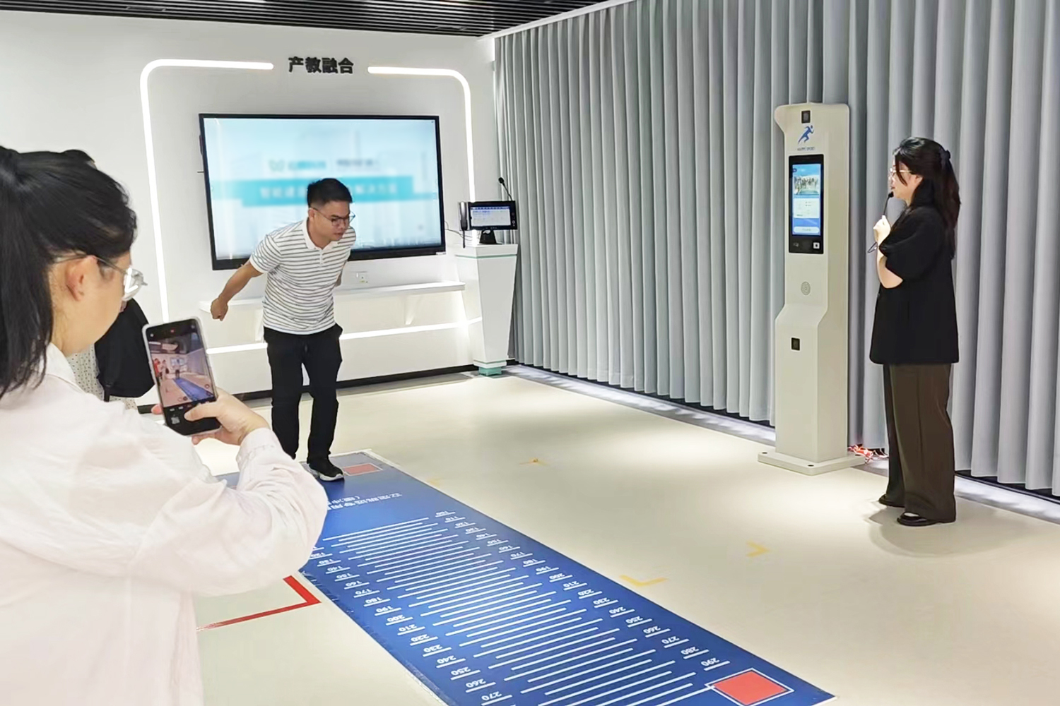 重在體驗的老師們還對云蝶智慧體育方案躍躍欲試?,F(xiàn)場架設(shè)的智慧體育考訓(xùn)一體機結(jié)合AI 算法,能夠?qū)⑴c姿勢類、球類、跑步類等運動項目的人員進行動作采集、分析與評價,從而精確便捷地指導(dǎo)體育考訓(xùn)。