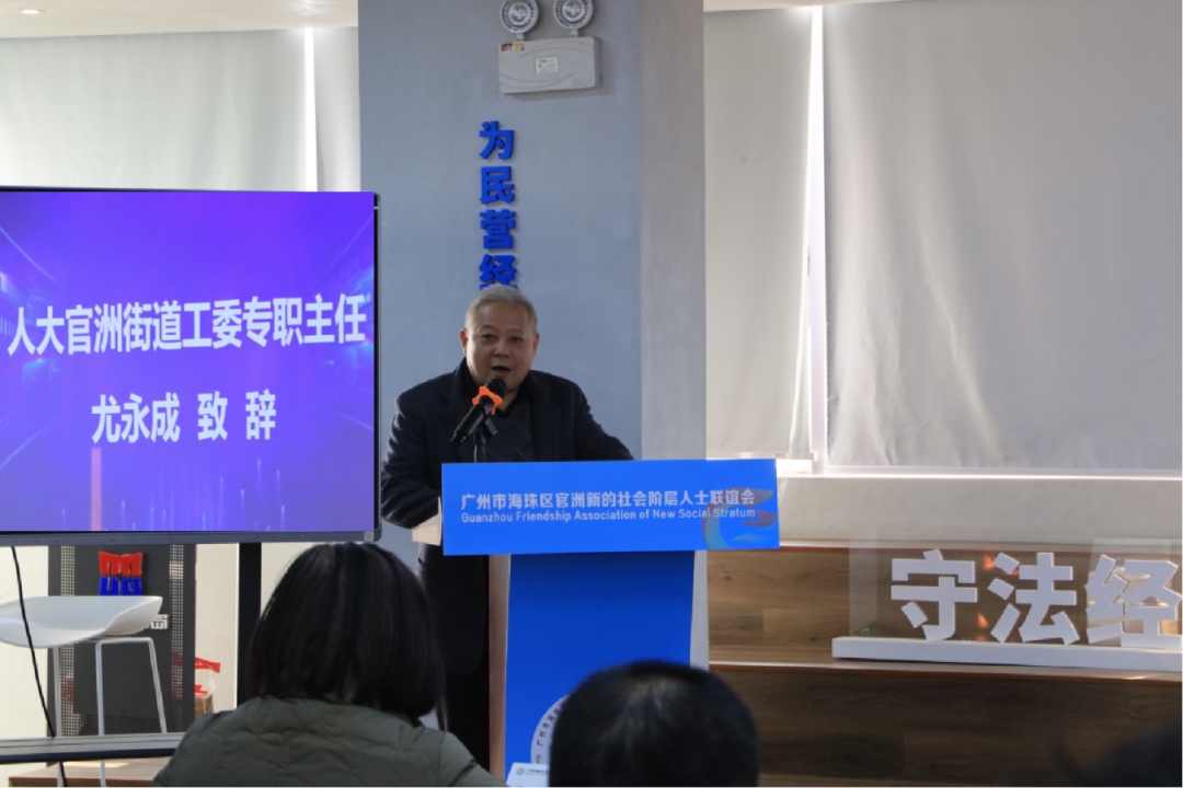 人大官洲街道工委主任尤永成代表街道黨工委、辦事處為大會致辭。他表示,新聯(lián)會的成立,將匯聚新的社會階層人士的磅礴力量,實(shí)現(xiàn)資源共享、優(yōu)勢互補(bǔ)、互利共贏,為官洲高質(zhì)量發(fā)展出謀劃策,貢獻(xiàn)力量。