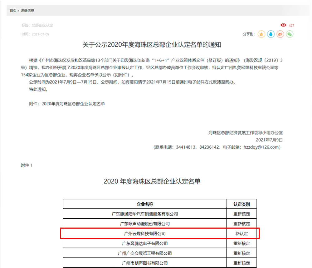 近日,云蝶科技被廣州市海珠區(qū)總部經(jīng)濟(jì)發(fā)展工作領(lǐng)導(dǎo)小組辦公室認(rèn)定為“2020年度海珠區(qū)總部企業(yè)”。