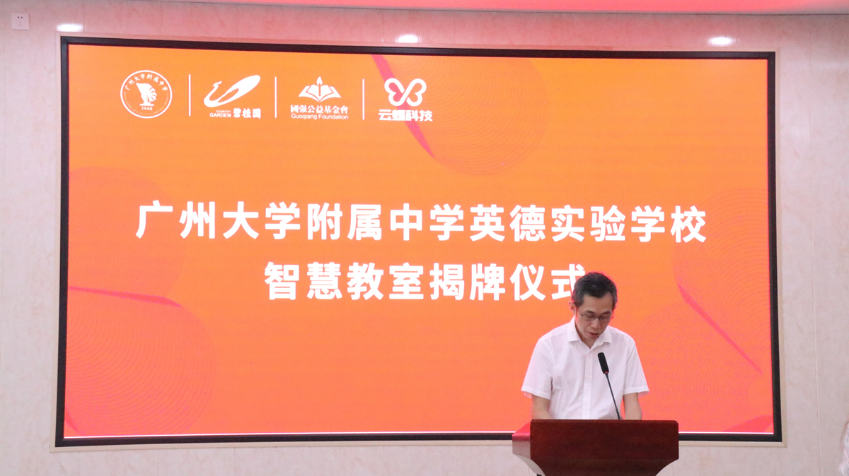 廣大附中英德實(shí)驗(yàn)學(xué)校是由英德市人民政府和廣州大學(xué)附屬中學(xué)合作共建的一所公辦完全中學(xué)。王群雄校長在致辭中代表學(xué)校向碧桂園及云蝶科技表示感謝,感謝智慧教室的建設(shè)讓山區(qū)孩子享受到與一線城市同等的教育資源。