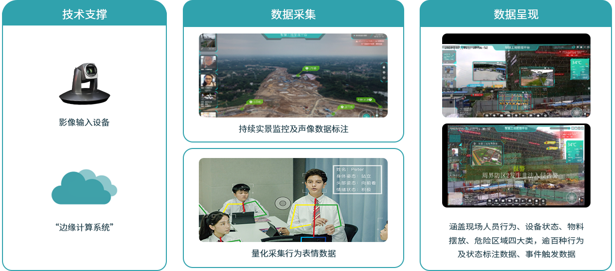 以聲像錄入設(shè)備與邊緣計算系統(tǒng)為核心,通過持續(xù)采集實景監(jiān)控、聲像數(shù)據(jù)、行為表情數(shù)據(jù)等,對數(shù)據(jù)進行標注與量化,對人員設(shè)備情況、事件發(fā)展情況、區(qū)域建設(shè)情況進行采集,為分析預(yù)判、規(guī)劃管理提供依據(jù)。